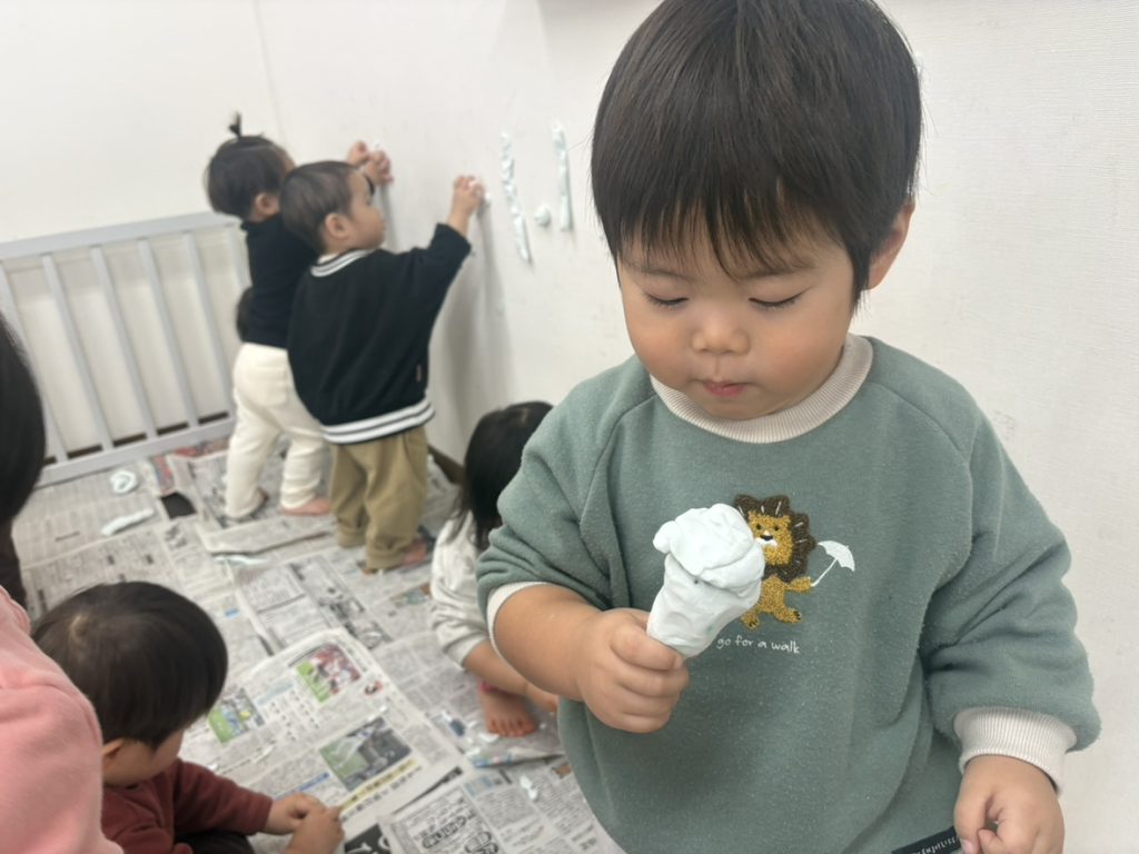 1歳児クラスでは『先生という安心基地を中心に自ら外界へと積極的に探索活動をする』という、心が育つことでこういった自ら行う探索活動によって自分から積極的に学びの姿勢へとつながっています。